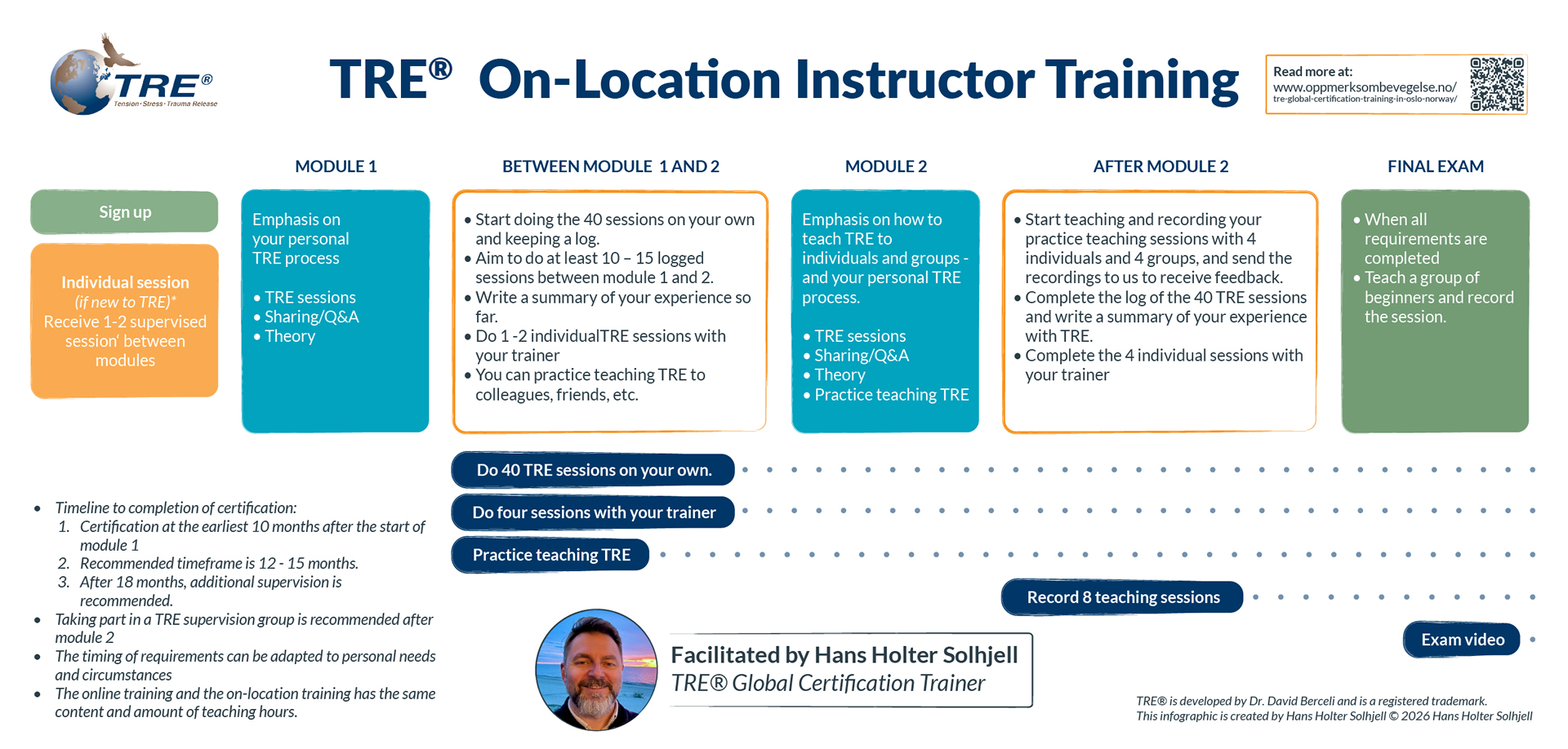 However, if you are a first-time participant in a body-oriented process, and if this seems challenging, either physically or mentally, we do not recommend starting your TRE journey in a training program, especially not online, and rather start with individual sessions or an introduction course.